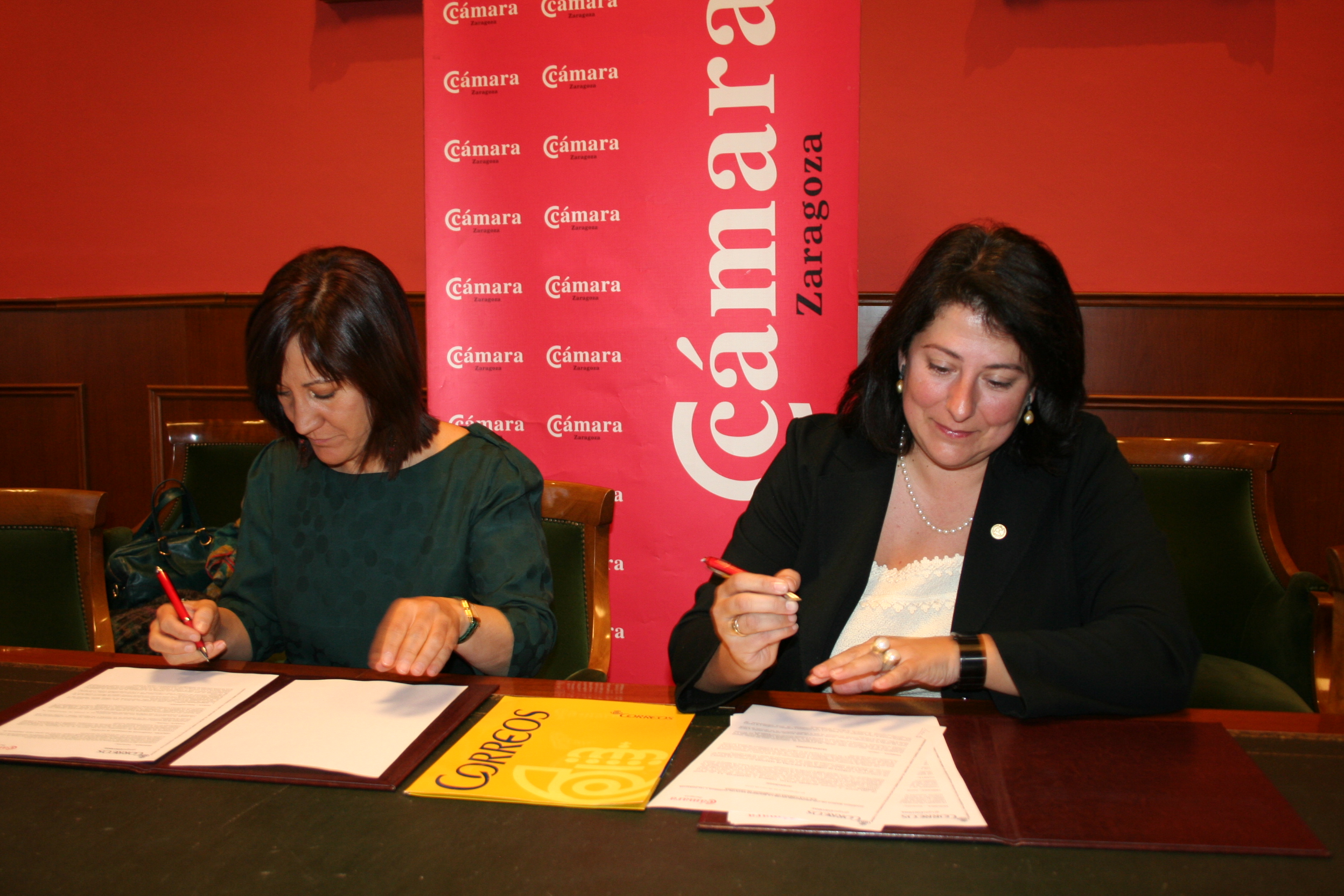 La directora territorial de la Zona 4 de Correos, Mª Paz Ansotegui, y la vicepresidenta primera de la Cámara de Zaragoza, María López Palacín, durante la firma del convenio de colaboración