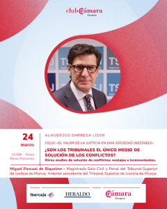 El segundo almuerzo contará con Miguel Pascual de Riquelme, magistrado de la Sala Civil y Penal del Tribunal Superior de Justicia de Murcia. Con una sólida experiencia en la jurisdicción civil y penal, abordará cuestiones relacionadas con la organización judicial, la eficacia de la justicia y su impacto en la actividad económica y empresarial.
