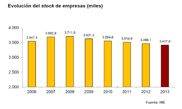 Según los datos del INE, en el año 2013, la economía española contaba con 3,418 millones de empresas, lo que supone un descenso del 1,4% respecto del año precedente, y revela la continuidad en la tendencia de minoración del número de empresas, desde el máximo de 3,712 millones registrado en 2008. Este descenso ha sido generalizado por sectores, Comunidades Autónomas y tamaños (estrato de asalariados). La única salvedad corresponde a las empresas sin asalariados, las cuales registraron más nacimientos que muertes, consiguiendo una tasa neta de crecimiento del 0,5%.