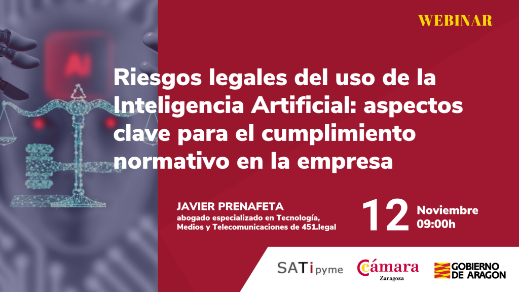 Cámara Zaragoza organiza este webinar en el marco del Convenio SATIPYME para hablar sobre los principales riesgos legales en el uso de la Inteligencia Artificial.