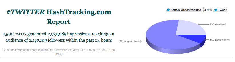 Aquí os dejo una serie de herramientas muy utiles para que podaís medir vuestro impacto en Twitter, desde el alcance de vuestros hashtag, menciones, impresiones de tweets, etc.. A curiosear!