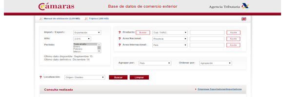 Las Cámaras de Comercio y la Agencia Tributaria, con el propósito de facilitar la estrategia de las empresas españolas en su esfuerzo de internacionalización, han elaborado una base de datos de comercio exterior en la cual ofrecen información ajustada, actualizada mensualmente y precisa sobre comercio exterior. La base cameral goza de indudables ventajas destacando, entre otras, la sencillez de manejo y la rapidez de acceso.