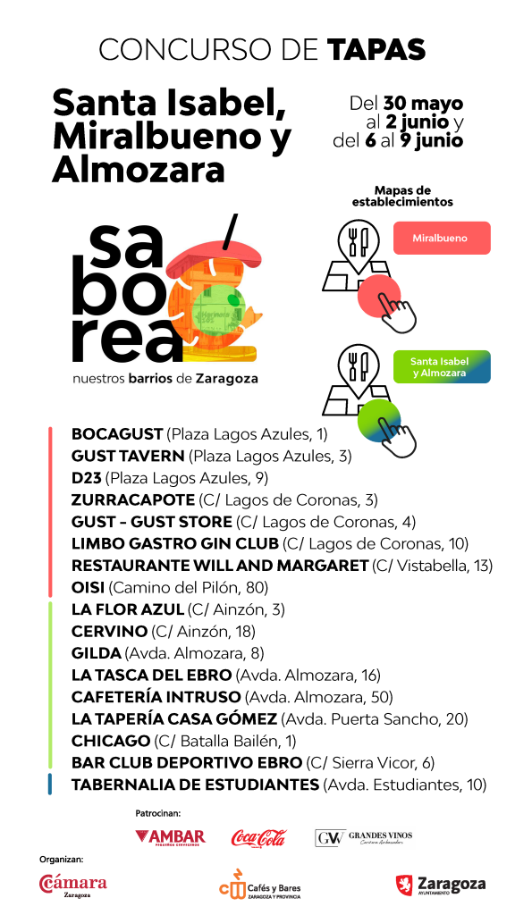 El Concurso de Tapas “Saborea nuestros barrios” representa una actividad gastronómica, enmarcada dentro de la marca Saborea Zaragoza, organizada por el Área de Economía, Transformación Digital y Transparencia del Excmo. Ayuntamiento de Zaragoza, en colaboración con la Asociación Profesional de Empresarios de Cafés y Bares de Zaragoza y Provincia, la Cámara Oficial de Comercio, Industria y Servicios de Zaragoza y las Juntas de Distrito.