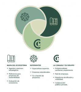 Nuestra comunidad se construye sobre tres pilares interconectados, que se complementan para impulsar los proyectos de sostenibilidad. Un Mapa del Ecosistema que permite identificar y conectar a los agentes principales y los recursos estratégicos, Referentes que comparten y aportan conocimiento, experiencia y liderazgo y la Cámara y su equipo que actúan como eje vertebrador de la comunidad, aportando profesionalidad, confianza y experiencia.